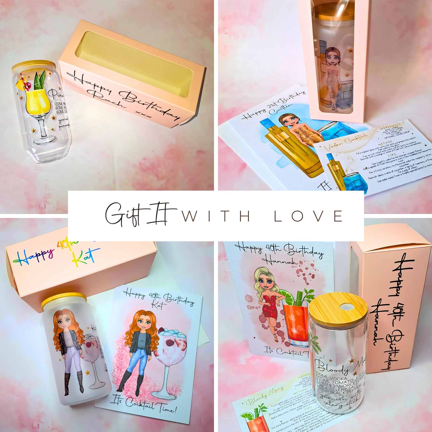 Add a luxury pink / holographic window box & personalise it with a name. Each gift comes with the glass, box & cocktail recipe card - gift it plus comes with a b-day card!