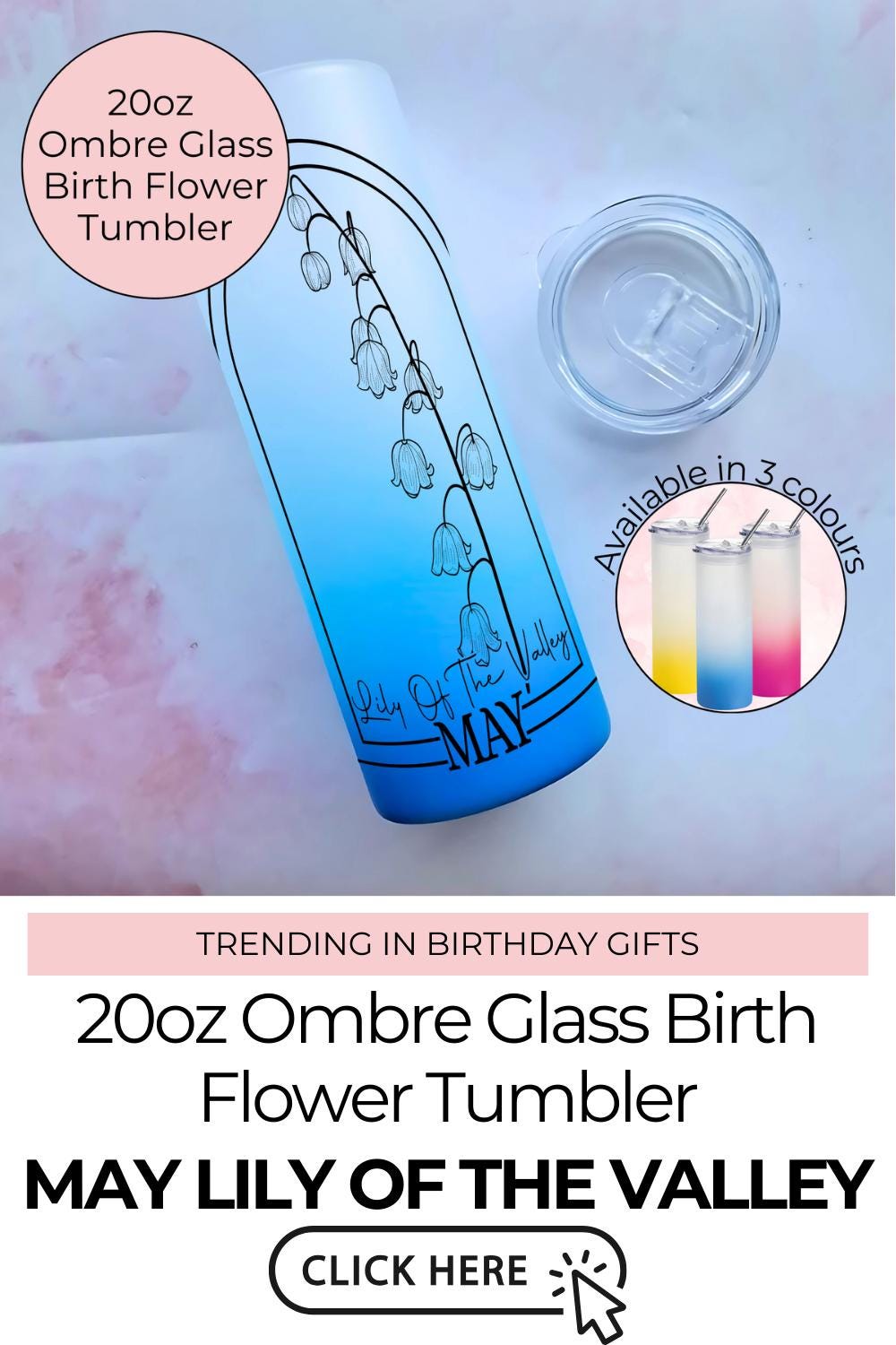 A beautiful 20oz frosted ombre tempered glass tumbler with plastic spill proof lid and metal straw. This glass is perfect for your cocktails, smoothies and other beverages to take with you on the go or keep for a desk drink, personalised with a birth flower for the recipients birth month. The decal is a printed onto glass design, irreversible and permanent. The design won't peel or scratch off, but is still not recommended to be placed in a dishwasher as the heat can make the design fade over time. If dishwashing is a must, please use the top drawer.
