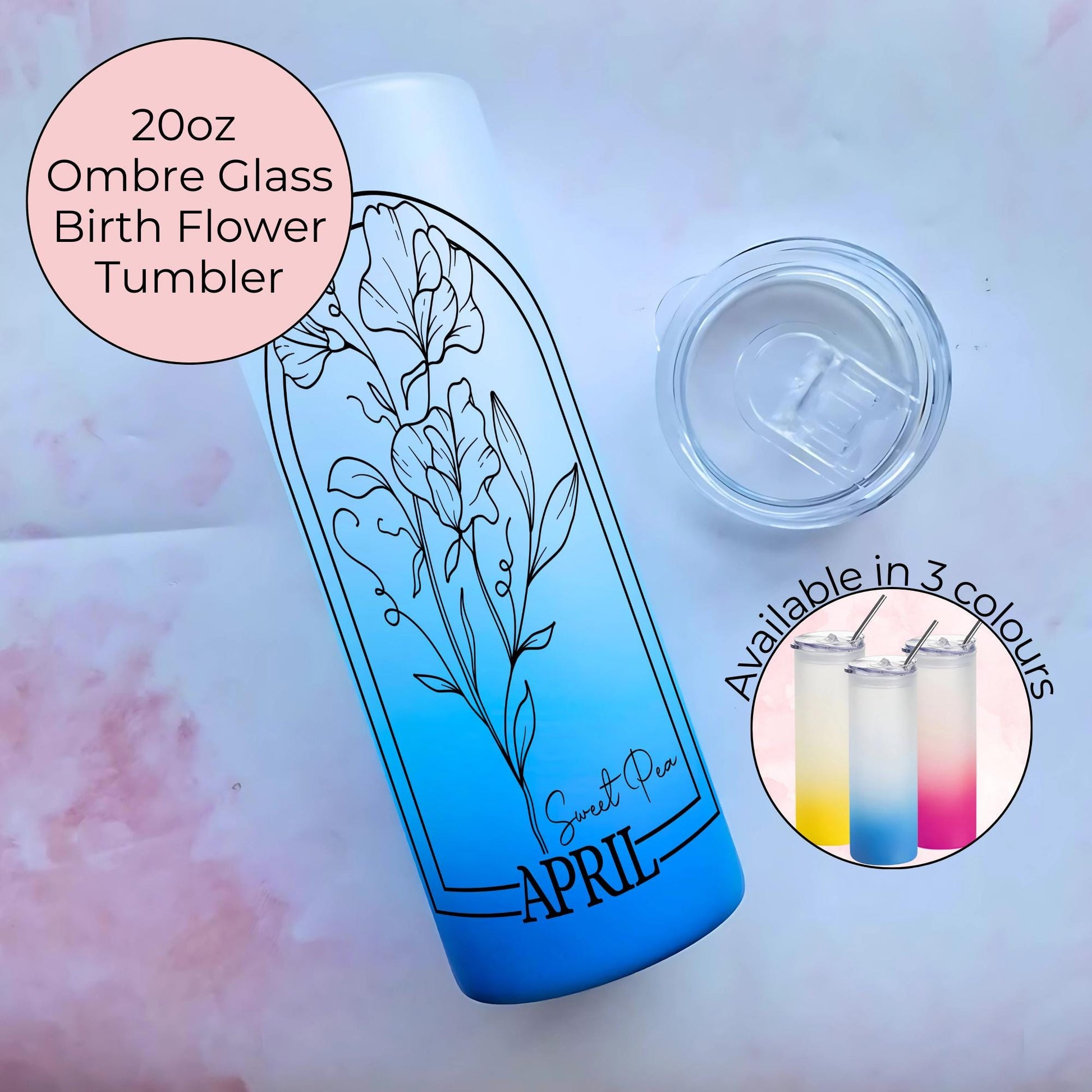 20oz Ombre Tempered Glass Tumbler, April Birth Flower Gift For Her, Bright Pink Blue Yellow Ombre Botanical Birth Flower, Sweet Pea Zodiac #BF