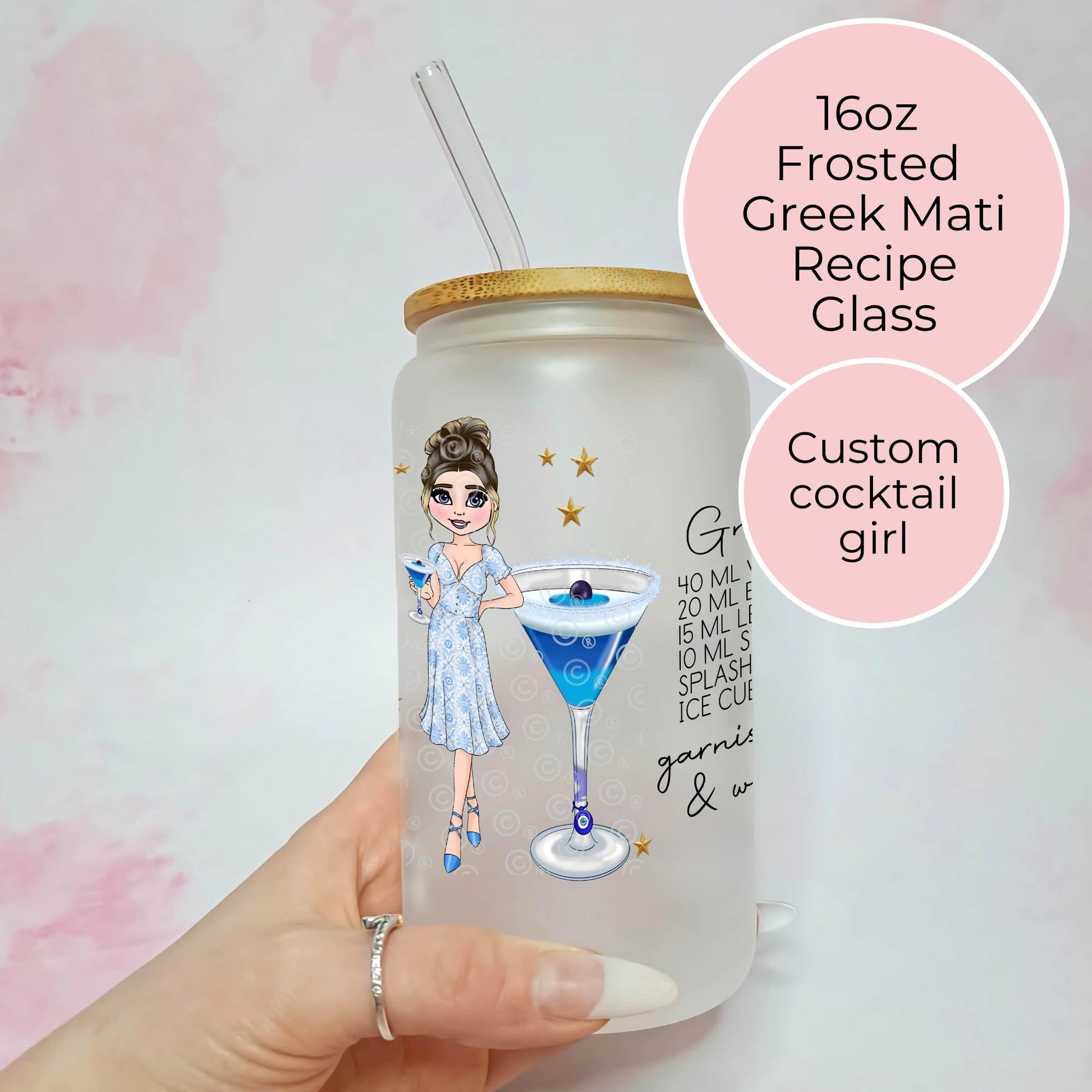 Greek Mati Custom 16oz Frosted Cocktail Recipe Tumbler, Milestone Birthday Gift For Sister Best Friend, Summer Soiree Themed Birthday Gift #FL