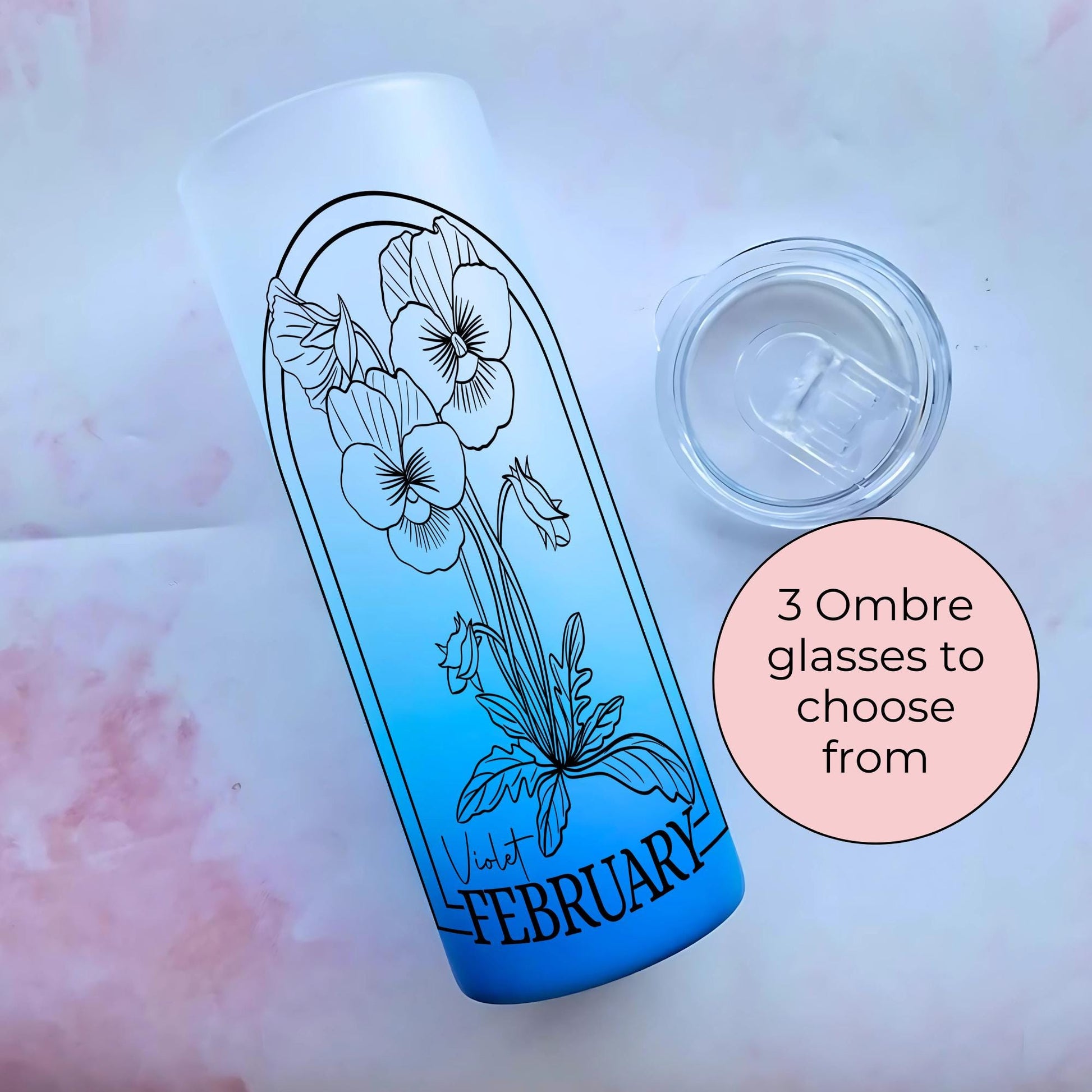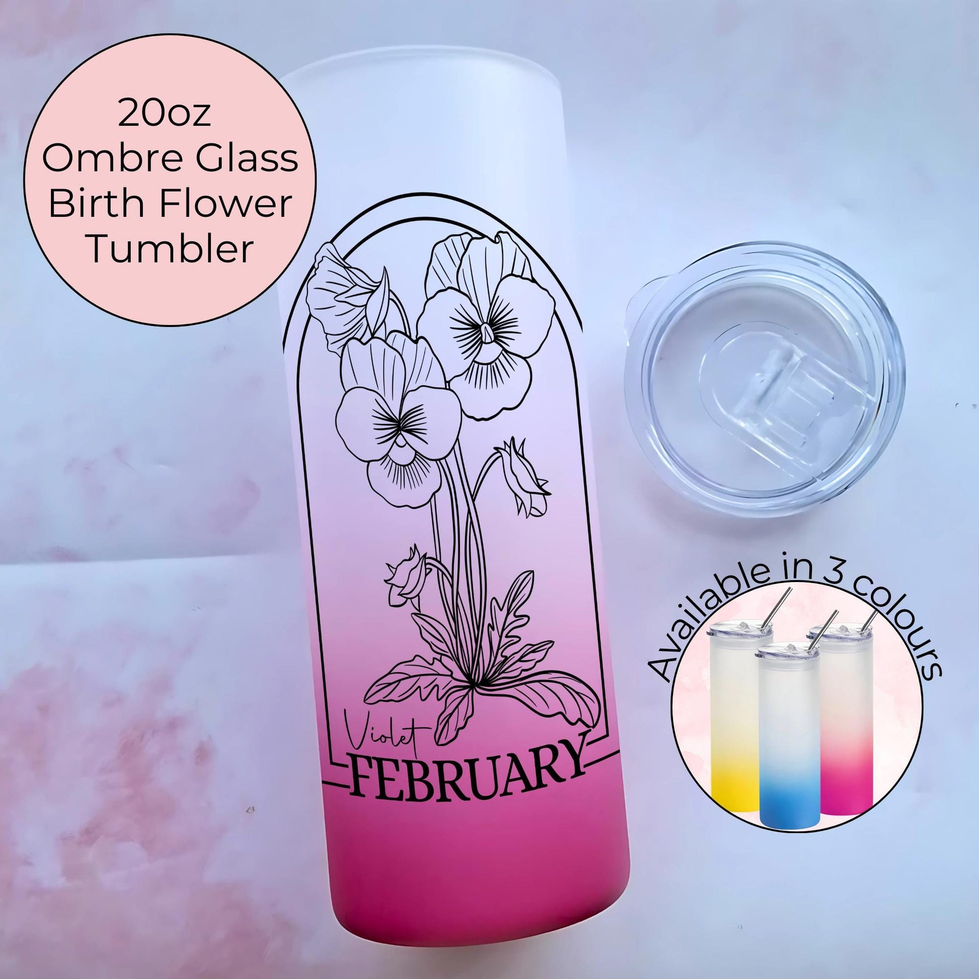 20oz February Birth Flower Gift For Her, 20oz Pink Yellow Blue Ombre Glass Tumbler, Teacher End Of Term Gift, Zodiac Violet Flower Birthday Gift #BF